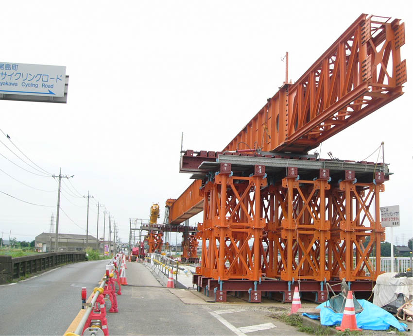 ![]() 仮設桁(手延べ桁)と 支保工(主桁横取り用フレーム) 早川左岸側から |