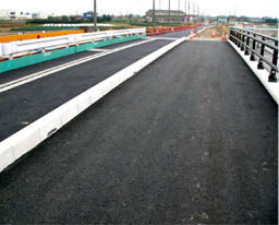 ![]() 完成した拡幅桁側橋面。 右側=幅員3mの歩道 左側=暫定開通の車道1車線 |