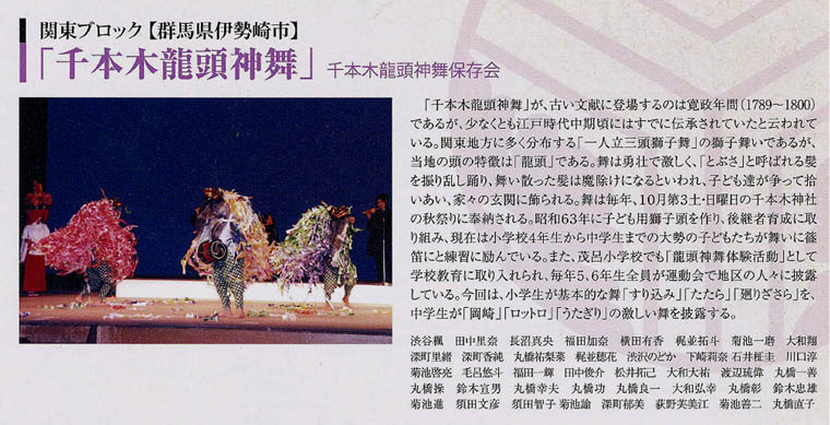 | 2011年8月20日(土)、東京の日本青年館大ホールにおいて、社団法人・全日本郷土芸能協会主催の「第13回こども民俗芸能大会」が開催され、伊勢崎市茂呂地区の龍頭神舞が関東ブロック代表として出演しました。 この日出演したのは、日本国内の7ブロック代表とロシアからのゲスト出演を加えた8団体。 各団体が色とりどりの衣装に身を包み、熱のこもった演技を繰り広げ、茂呂地区の小中学生も素晴らしい龍頭神舞を演じ、大勢の観客から惜しみない大きな拍手が送られました。 この日、演じたこどもたちに付き添いとして同行したSuh sanから当日の様子を伝える写真が届きましたので、ここに紹介します。 他のブロックは下記の通り。 ・葛畑(かずらはた)農村歌舞伎・・・兵庫県養父市 ・佐喜浜(さきはま)にわか・・・高知県室戸市 ・対馬厳原(つしまいずはら)の盆踊(曲(まがり)の盆踊) ・・・長崎県対馬市 ・晴山(はれやま)獅子舞・・・青森県十和田市 ・敷地天神(しきぢてんじん)蝶の舞・・・石川県加賀市 ・ウリチ民族の伝統舞踊・・・ロシア連邦 ・鬼柳鬼剣舞(おにやなぎおにけんばい)・・・岩手県北上市 (2011/8/22 記) Photo by Suh san |