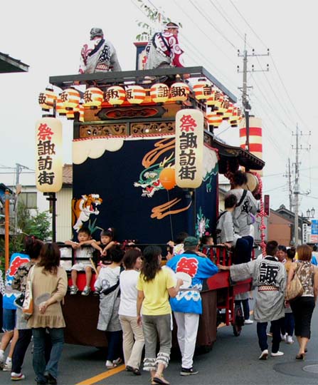 ![]() 上街 ![]() 諏訪街 ![]() 諏訪街。 レイディ二人が涼やかに両脇に立つ姿が祭りに粋な雰囲気を加えます。 |