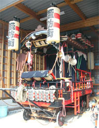 →→ 国道354号がパレードで賑わう頃 交差する脇道には地元諏訪街の 山車が出番を待って位置に付き、 子供や大人たちが お囃子の演奏を始めます。 各区の山車が それぞれに特徴を持っていますが、 諏訪街の山車は 前面両脇に白と紫の着物に 身を包んだ女性が立ち 遠目にもすぐに分かります。 |
