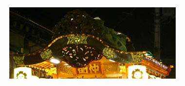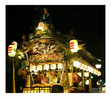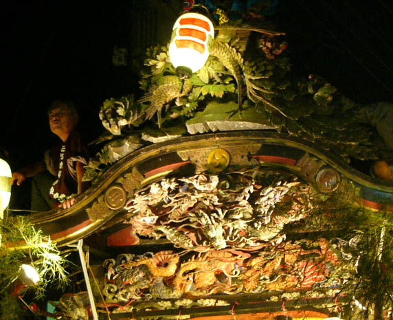 | 神輿パレードが終わる頃には夜の帳が下りて来ます。各区から人々に曳かれて巡行して来た山車が、交通止めの国道354号の東端部に待機し、時を待って1台ずつ縦列で人々の前にその雄姿を見せます。 どの山車にも立派な彫り物が施され、山車の舞台で繰り広げられるお囃子演奏だけでなく、闇夜の中に提灯の明かりで照らし出された彫り物や舞台の飾りにも目を奪われます。各区ごとに特色ある山車の形状と見事な彫り物をご覧ください。 |