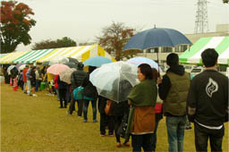 ● 会場に到着してみれば、混雑は例年とそれほど変わらずに驚くばかりです。恐るべし、境地区の住民パワー!会場で会った顔見知りの皆さんとお喋りすると、「昼食を食べて、無料配付が終わればみんな帰っちゃうよ」と自虐的な感想が返って来ましたが、その傾向は天気に依らず他の産業祭でも同様なこと。ただ、「こんな天気だから、皆さん遠くへ出かけなかったんじゃないかね」には思わず納得。世の中、何が幸いするか分かりません。産業祭にとって、晴れるばかりが好条件じゃないかも知れないと認識を新たにしたところです。 でも、それだけじゃなく、境地区の皆さんが年に一度のこのビッグイベントを楽しみにして、悪天候も吹き飛ばしてしまうエネルギーを持っていること、それがこの賑わいの理由と思いました。 流石に芝生の上に品物を並べるフリーマーケットコーナーは歯抜け状態でしたが、事前応募では全区画が埋まっていたとのこと。