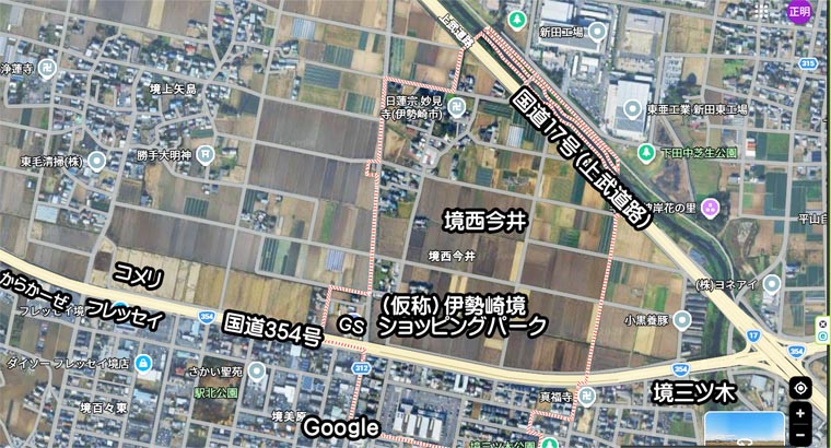 | 2年前、当サイトの「伊勢崎市と周辺のお店、会社、施設」の掲示板にハリーさんから「ツルヤ境町店」出店の記事を投稿していただきました。その後、「通りかかり」さんや「通りかかりの人」、「とある通りすがり」さんらから関連情報を投稿していただき、昨日は「とある通りすがり」さんから、群馬県ウェブに掲載された最新の大店法情報を教えていただきました。投稿、ありがとうございました。 早速に確認してみると、「ツルヤ境町店」は単独店でなく、(仮称)伊勢崎境ショッピングパーク内の核店舗として出店し、パーク内にはテナント棟も建設されるよう。前橋南ショッピングパークと同様の形態かも知れません。オープンは令和9年(2027年)11月1日、今から21か月後です。 当ページでは、当商業施設の建設状況やオープン情報を適宜掲載して参ります(2026/2/1 記)。 ![]() (仮称)伊勢崎境ショッピングパーク位置図 (進捗に応じて適宜更新)(©Google Mapに加筆) |
