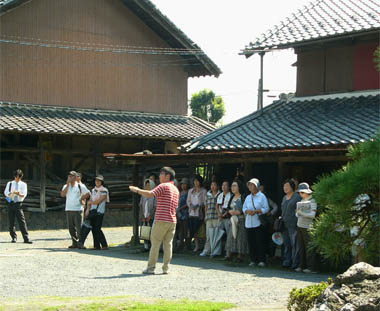 ![]() 表門と桑場(左)、後方は主屋 2012/8/19 ![]() 別荘(左後方)、桑場(右) 解説員の大澤さんの説明を聴く参加者 2012/9/13 |