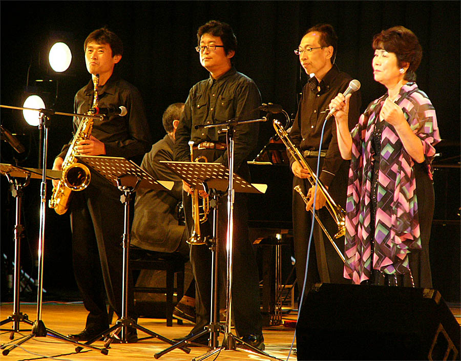 ![]() (38)テナーサックス・トランペット・トロンボーンの3管とボーカルの組み合わせで 「嘘は罪」 ![]() (40)しっとりと歌うヨシエさん |