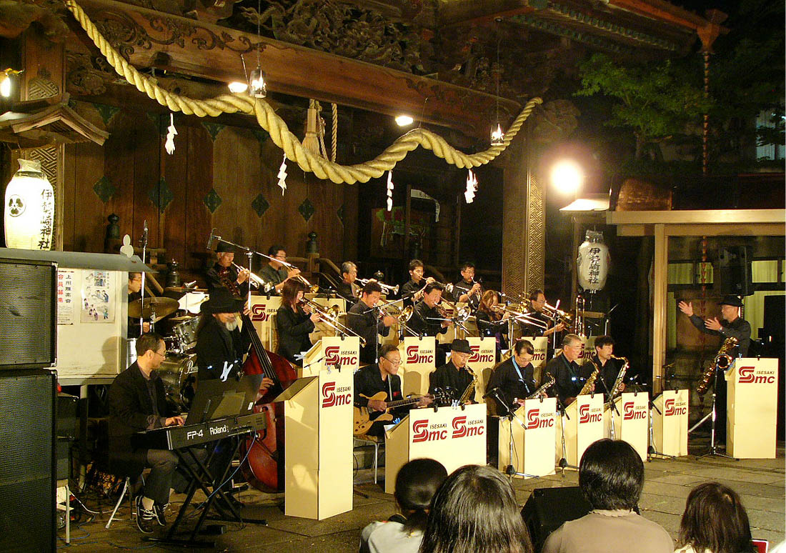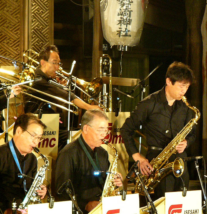 | 例年のこの時期の夜は肌寒くなる陽気。今年は日中の気温がどんどん上がり、昼間、波志江沼環境ふれあい公園で開催された「絣の郷・交流まつり」に参加していても夏のような暑さ。群馬県高崎市では30度超えの気温を記録したとテレビのニュースで放送していました。その暖気が夜までちょうどいい塩梅に残されて、神社境内は気持ちの良い気温に包まれました。 その心地よい気温の中、伊勢崎神社の社殿と巨木に囲まれた境内で、今年もまたSMCの素敵なジャズサウンドにスッポリと身を包み、身体中の隅々までが浄化されたような気持になりました。今年はコンボ編成とヴォーカルだけの静かな曲なども加わり、ビッグバンドの音とはまた違った味わいがあって、幅広いSMCの力を見せてくれました。 この贅沢なひと時をプレゼントしてくれるSMCの皆さん、燈華会実行委員始め関係者の皆さん、毎年ありがとうございます。とても楽しくゴージャスなひと時を過ごす事ができました。(2011/10/22 記) |