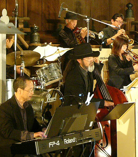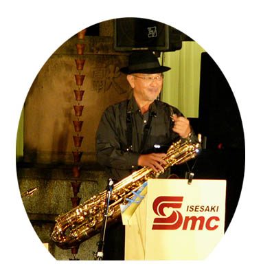 ![]() (4)Pianoの小杉さんとBaseの大林さん。 後ろに境内の掲示板で隠れたDrumsの増尾さん。 ![]() (6)ご存じ、バンドリーダーのSuh san。 楽器はBaritone saxです。 |