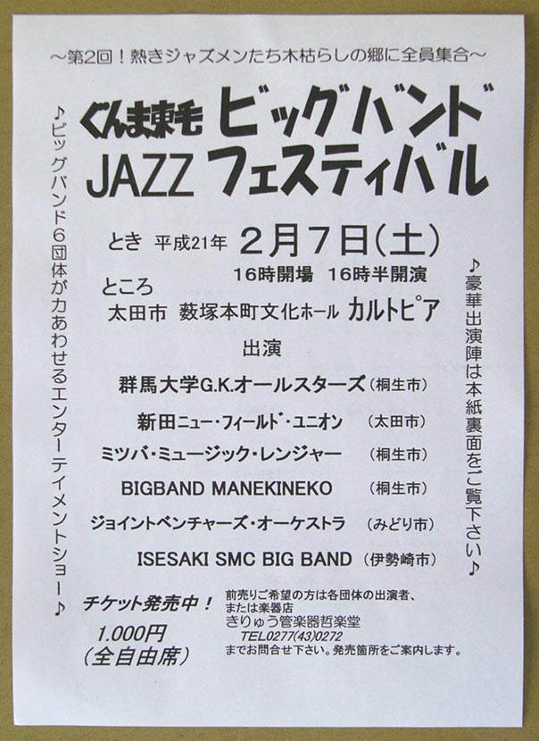 | 【日時】 2009/2/7(土) 16時開場 16時半開演 【場所】 太田市薮塚本町文化ホール カルトピア [ goo地図 ] 【出演バンド】 (下記6バンド:出演順) ・群馬大学GKオールスターズ(桐生市) ・新田ニューフィールド・ユニオン(太田市) ・ミツバ・ミュージック・レンジャー(桐生市) ・BIGBAND MANEKINEKO(桐生市) ・ジョイントベンチャーズ・オーケストラ(みどり市) ・ISESAKI SMC BIG BAND(伊勢崎市) |