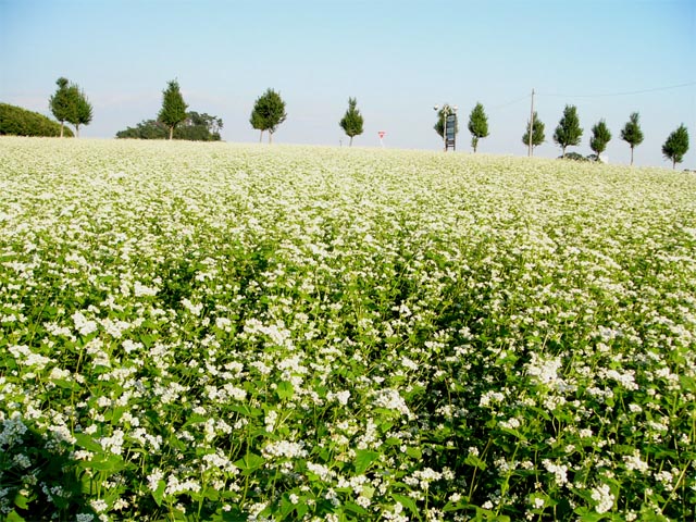 | 毎年、10月に入ると波志江町の何ヶ所かで蕎麦の花が咲きます。伊勢崎斎場(赤城見台公園)の南側の緩斜面、グリーンパークの南西側の田んぼ、波志江沼周辺、いつの頃からこの辺に蕎麦が栽培されるようになり、「波志江の蕎麦」として地元の名産品になっています。毎年、蕎麦のイベント「そばの里はなまつり」が開催されます。 私も蕎麦は大好きで、毎年の大晦日の日には近所の友人の家で年越し蕎麦を打ちます。その旨いことと言ったら筆舌に尽くしがたいものがあります(自画自賛)。もう何年も続いている年中行事ですが、何年やっても師匠のアドバイスがないと成功しません。今年(2008年)もサイクリングがてら撮影しましたが、昨年同様、畑一面を白い花で埋め尽くしていました。今年は昨年より更に耕作面積が広がったようです。(2007/10/11 記、2008/10/12 追記) |