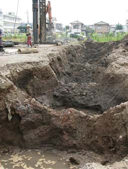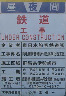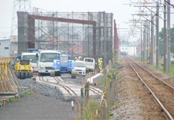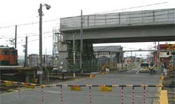 | 駅西でH18年末から行っていた切替え用レール敷設工事も終了し、いよいよ9/29〜9/30には切替え工事が行われます。新たな工事ステップです。 駅北では工場や住宅がほぼ解体され、新設道路の工事やボーリング調査が行われています。 駅東では、昨年秋から行っていた踏切ヶ所の高架橋が完成し、それと連続して東側へ延伸していたブロックが完了しました。現在は更にその東の高架橋予定地でボーリング調査や柵作りが行われています。(2007/9/28 記) |