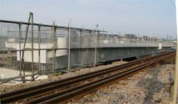 ![]() 防護柵が取り付いた仮設桁 (東側桁端部) 2009/2/22 ![]() 防護柵が取り付いた仮設桁 (西側から) 2009/2/22 ![]() 仮設桁を東側から。 左端:暫定的に切り替えた軌道 中央:廃止された旧軌道 工事中ならではの光景 2009/2/14 ![]() 仮設桁を南側から 2009/2/14 ![]() 仮設桁の西側端部。 コンクリート部が橋脚 2009/2/14 ![]() 仮設桁の桁下を西側から 2009/2/14 |