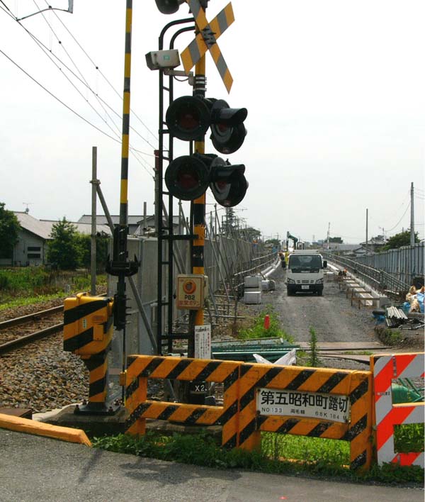 ![]() 第五昭和町踏切。 右側が工事区間。 高架橋は、この辺で ほぼ現地盤の高さにすり付きます。 2009/5/30 |