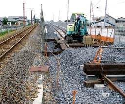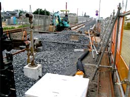 ![]() 第五昭和町踏切の東側 右側:現在の軌道 中央:敷設中の新しい軌道 2009/8/15