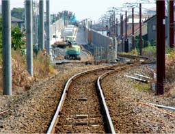 | JR両毛線の第五昭和町踏切が複線に?? 2009/9/19、前回から約1ヶ月振りの第五昭和町踏切では新しい軌道の敷設が進行中で、一時的ではありますが複線になっています。踏切から伊勢崎駅方面を眺めれば、完成した高架橋には見渡す限り新軌道が敷かれています。全区間の軌道の敷設がどこまで進んでいるのか気になりますが、遠からず、アイタワーから眺めて確認してみましょう。 |