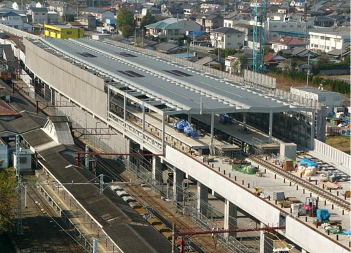![]() 南口の東武伊勢崎線ホーム側から 後方に建設中の伊勢崎駅駅舎 |