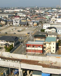 | 2009年9月末頃には高架橋の架橋工事が全区間で完了し、以来、下から写す高架橋工事風景の変化が乏しくなり、現場に運ぶ足の回数も減っていましたが、軌道部の工事もたまには紹介しようと思い立ち、2009/11/7、アイタワー花の森から駅周辺の軌道工事の様子を撮影しました。鳥瞰図(Bird