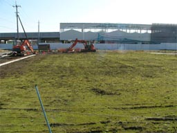 ![]() 昭和町踏切から見る軌道部工事 ←現在の軌道 + 工事中の新軌道→ 2009/10/31 ![]() 粕川左岸堤防脇(右の盛土)に新設される人道ボックス。開通は現在軌道撤去後になります。2009/10/31 ![]() |
