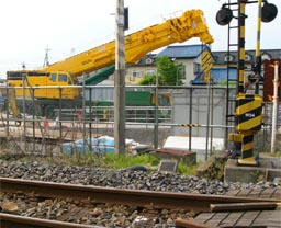 | 踏切東側の橋脚付近 | 六間道路上の作業風景 | 踏切西側の橋脚付近 |