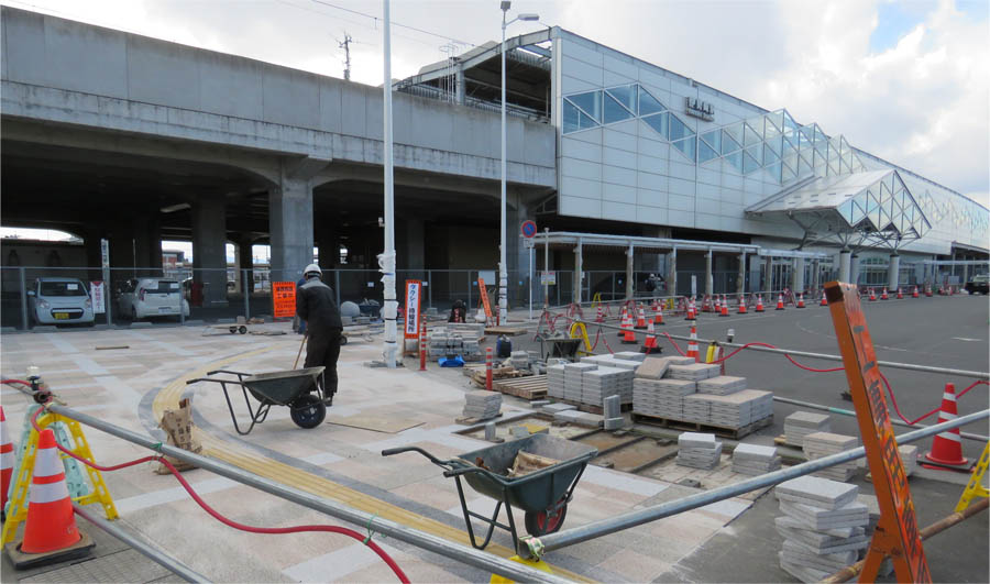 | H28年度工事もそろそろ終盤。伊勢崎駅北口では駅前広場関連の様々な工事が進んでいます。2月11日時点で、連続屋根設置工事はほぼ完了した様子で、現在その周辺のインターロッキング舗装工事が進んでいます。ロータリー内でも舗装面を剥がし、照明柱と思しき支柱の施工等が進んでいますが、完成形状はまだ見えません。(2017/2/13 記) | ||||||||||||||||||||