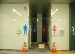 ![]() 改札内の1F通路 ![]() トイレ ![]() 左:1Fと2Fのホームを繋ぐ階段 |