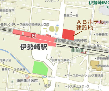 | ・施設名:(仮称)ABホテル伊勢崎 ・住所:伊勢崎市喜多町29-2(仮換地16街区) ・敷地面積:1,752u ・延べ面積:2599u ・規模:地上8階 高さ:25.87m ・工期:平成25年12月頃〜平成26年11月頃 (*)工期は平成27年6月頃〜平成28年3月頃に変更になっています。 ・建築主:株式会社東祥(愛知県安城市) |
