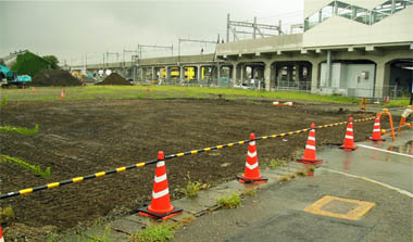 ![]() (仮称)ベイシア伊勢崎駅前店建設予定地とその南側に立った「建築計画のお知らせ」 2014/8/7 ![]() (仮称)ベイシア伊勢崎駅前店建設予定地(建設地南西角から)。左後方は伊勢崎駅。2014/8/7 |