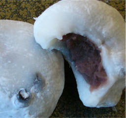 | ・・・と、写真で味が伝わったでしょうか。 岡埜栄泉(虎ノ門)の豆大福の味は、最初の一口がまず「塩の甘さ」。塩が砂糖の甘さを上品に引き立て、砂糖の甘さだけの単調な甘さでなく、ふくよかな深みのある甘さに仕上げてくれています。甘いのにスッキリとしていると言った感じです。 次に感じるのが餅の歯応え。手に取ると溶けてしまうほどに柔らかいのに、不思議な事に噛んでみると歯応えがあり、「おや?何で?」と軽い驚きと安心感を感じます。歯切れも良く、歯に付く感じは全くありません。 そして次なる楽しみは餡子の中の豆。餅の部分の黒豆は期待どおりで、豆と餅を交互に味わう楽しみを与えてくれますが、予期せぬ驚きが餡子の中。こし餡だけと思っていたのに何かコリッとした歯ごたえがあり、確認はしませんでしたが、多分、豆が混じっているようです。つぶし切らなかった小豆と言うより、もっと存在感を感じる豆の感じでした。 大福一つの大きさが結構大きいので、一つがちょうどいい量だと思いますが、私は3時のおやつに2個食べてしまいました(食べ過ぎ?)。噴門の弁の機能が弱くて添加物入りの食べ物は必ずと言っていいほど胸焼けを起こす私ですが、この大福は全くノープロブレムでした。 伊勢崎市には様々な饅頭があって、「饅頭の伊勢崎」と言う観光化もできるのじゃないかと密かに思っているのですが、創業百数十年続く東京の老舗の大福の味は大いに刺激になるのじゃないでしょうか。(2011/5/3 記) |