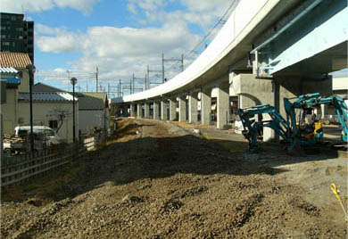 2014/5/31この区間では、以前、東武伊勢崎線・伊勢崎終点駅があった付近の区間約40m((都)7・7・21号線)が基層舗装までを完了し、その地点以東〜六間道路間においては、旧鉄道敷の盛土撤去や整地作業を終え、六間道路寄りでは丁張り測量等が進んでいます。基層舗装完了区間の部分開通は行われていません。(2014/6/9 記)→六間道路〜太田県道区間の近況はこちら (都)7・7・21号線(高架南4号線):基本幅員=6m、L=250m |