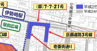 東武伊勢崎線高架化工事完成後、伊勢崎駅南東側では東武線仮駅舎が撤去され、伊勢崎駅〜公園通り間では整地作業も完了しています。伊勢崎市の情報によれば、東武伊勢崎線高架橋の南側に都市計画道路7・7・21号が新設されるようですが、現時点ではその動きは確認できません。公園通りの東(アイタワー花の森北側)付近では整地作業が進行中です。この位置にも道路が新設されるようです。東武伊勢崎線・新伊勢崎駅東側においては区間長=179.5mの道路工事が進んでいます。(2014/1/29 記) |
