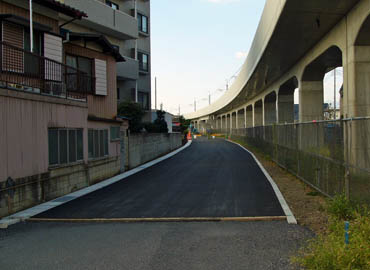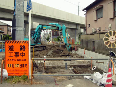 ![]() 六間道路との交差部の西側。丁張り測量進行中。 2014/5/31 ![]() 六間道路から西側。六間道路も工事進行中。 2014/5/31 |