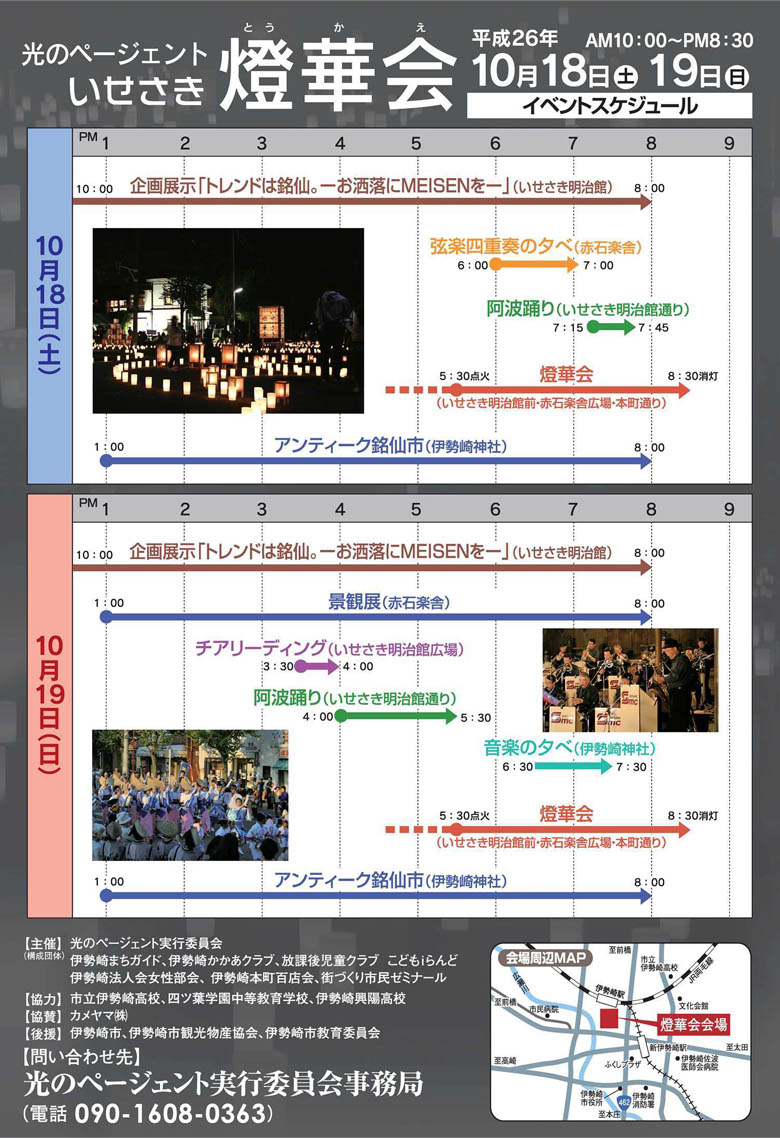 | 10月18日(土)、19(日)の2日間、今年もいせさき燈華会(とうかえ)が開催されます。主催は光のページェント実行委員会、後援は伊勢崎市、伊勢崎市観光物産協会、伊勢崎市教育委員会です。 明治館通りや赤石楽舎広場がロウソクの灯りで柔らかく温かく包まれるこの催し、今年で10回目を迎えます。阿波踊りやチアリーディング、弦楽四重奏やジャズコンサート、明治館の銘仙企画展示、アンティーク銘仙市、景観展など、燈籠だけでなく、様々な協賛イベントも催されます。 (2014/9/27 記)