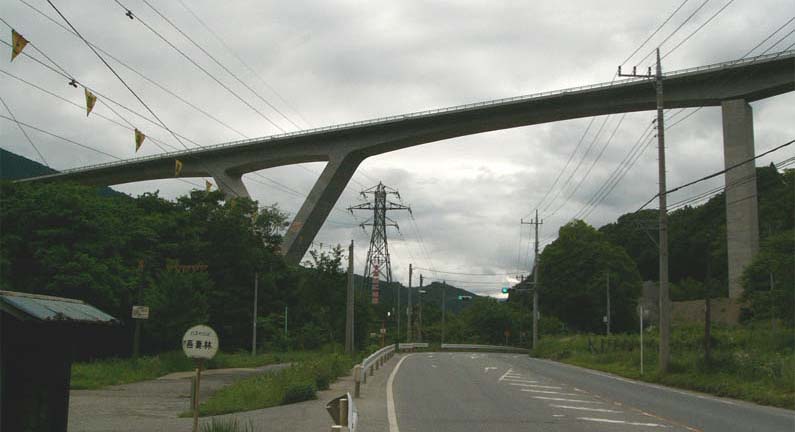 | ■型式:5径間連続鋼コンクリート複合トラスエクストラドーズド橋 ■道路:県道林岩下線(右岸側の新川原湯温泉街と左岸側の付替え国道を結ぶ) ■橋長:590m ■支間割:63.4+125.0m+155.0m+155.0m+88.4m■有効幅員:13.0m(歩道3.0m+車道7.0m+歩道3.0m) ■設計活荷重:B活荷重 ■施行方法:超大型移動作業車を用いた片持ち張出し架設 ■工期:2004年3月〜2011年3月(実際の完成は2011年4月) 鋼・コンクリート複合トラス橋は、従来のPC箱桁橋のウェブを鋼管トラスとした構造。特徴は・・・