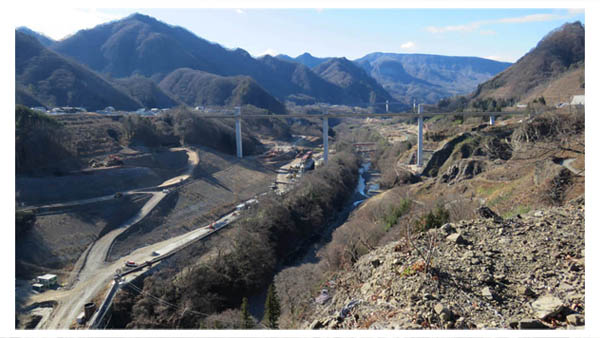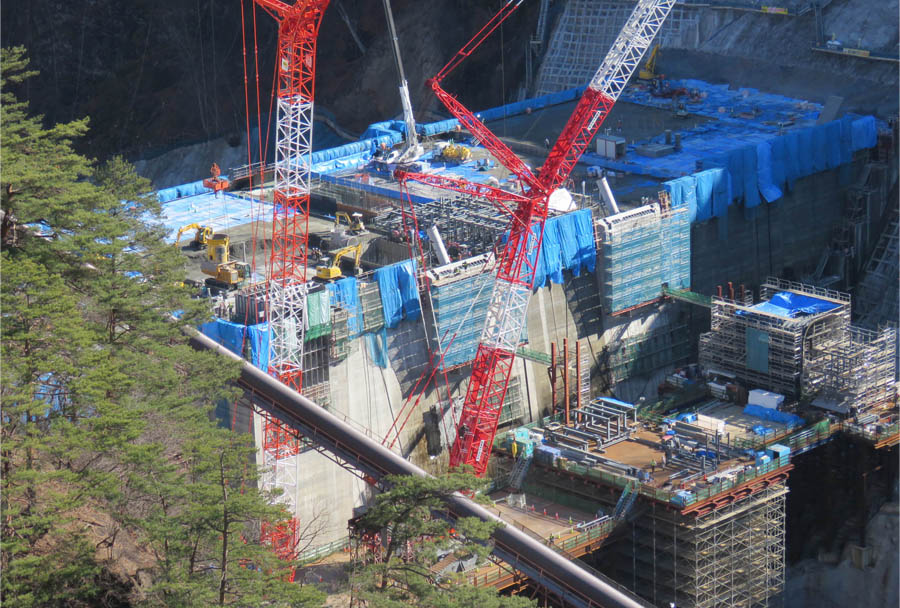 | 建設工事が進む「八ッ場ダム」。 2017年12月9日、見学用展望台「やんば見放題」や八ッ場大橋から眺めた建設現場の様子です。ダム本体のコンクリートは58m(堤高116mに対して5割)を打設中。(2017/12/17 記) | |