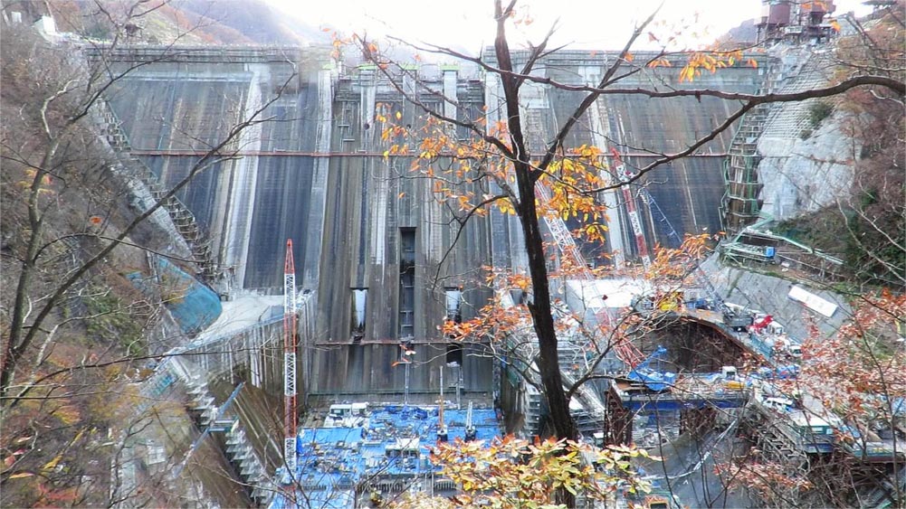 | 2017年12月9日日を最初に、過去4回紹介している八ッ場ダム建設現場。主に上流左岸の「八ッ場見放台」からの風景が中心で、前回10月20日には、上流右岸側から眺めるナイトツアーの光景を初めて紹介しました。その日、吾妻峡を「熊の茶屋」まで歩き、下流側からの姿を木々の間から覗き見ましたが、落葉し切らない木々や距離が遠かったことなどから、展望は今一つでした。 そんな思いが残る八ッ場ダム建設現場ですが、先月11月17日、ダム直下の小蓬莱(見晴台)に登り、一望して来ました。見晴台は最寄り駐車場「十二沢パーキング」から徒歩35分。車道から下り、鹿飛橋から登山道へ入ってからも約25分。道幅が狭く、途中2,3ヶ所、また見晴台手前は急勾配の山路ですが、眼下にダム下流側の建設現場が広がり、ダム下流のビュースポットとしては最高の場所です。 ダム直下左岸では八ッ場発電所(群馬県施工)の建設も進み、本体工事と発電所工事が各所で進んでいました。 途中、吾妻峡の紅葉(→吾妻峡)を楽しみながらの登山&ダム建設現場見学でした。(2018/12/4 記) 以下、群馬県ウェブサイトを参照しました 八ッ場発電所■概要:八ッ場ダムの放流水を利用したダム式発電所。ダムの利水放流管から分岐した発電専用管により、ダム直下左岸に設置する発電所で発電を行う。■最大出力:11,700kW(キロワット) ■年間発電電力量:約4,200万kWh(キロワットアワー。一般家庭約12,000世帯分の消費電力量) ■最大使用水量:13.60立方メートル/秒 ■有効落差:105.80メートル ■総事業費:71億円 ■工事期間:平成27(2015年)年4月〜平成32年(2020年)3月 |